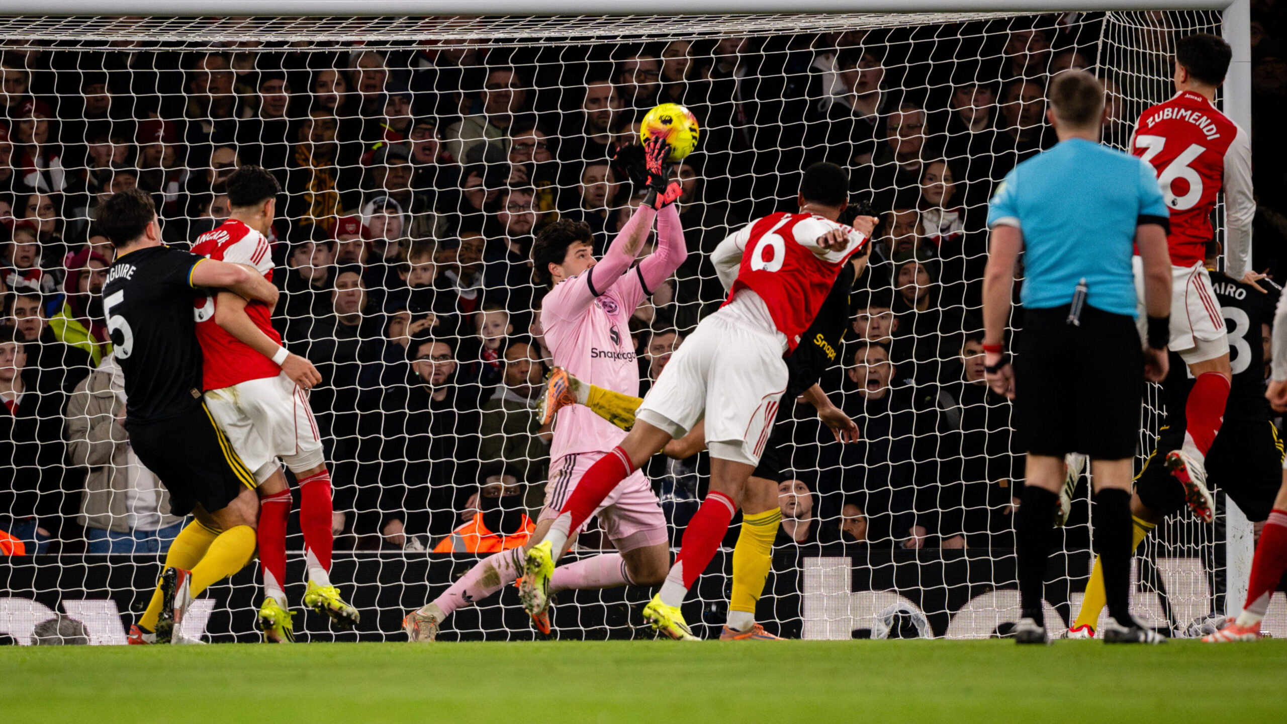 Les Gunners ont dominé les premières minutes et ont fini par concrétiser leur domination dès la 29ᵉ minute, quand un centre offensif finit au fond après une déviation : but contre son camp de Lisandro Martínez, offrant l’avantage à Arsenal. Manchester United ne tarde pas à réagir. Profitant d’une erreur de relance de la défense londonienne, Bryan Mbeumo égalise à la 37ᵉ minute en récupérant un ballon mal joué pour battre le gardien adverse, et renverse légèrement la dynamique avant la pause.