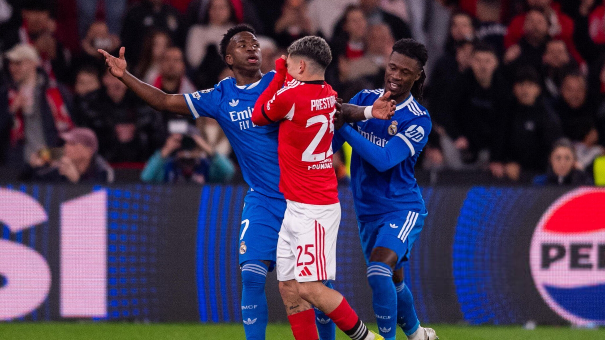 Après l’ouverture du score, somptueuse, signée Vinicius Jr, Prestianni s’est approché du Brésilien pour lui adresser des propos en se dissimulant la bouche avec son maillot. Une attitude qui a immédiatement provoqué la colère du numéro 7 madrilène. Vinicius s’est alors dirigé vers l’arbitre François Letexier, entraînant l’activation du protocole antiracisme et l’interruption du match pendant près de dix minutes.